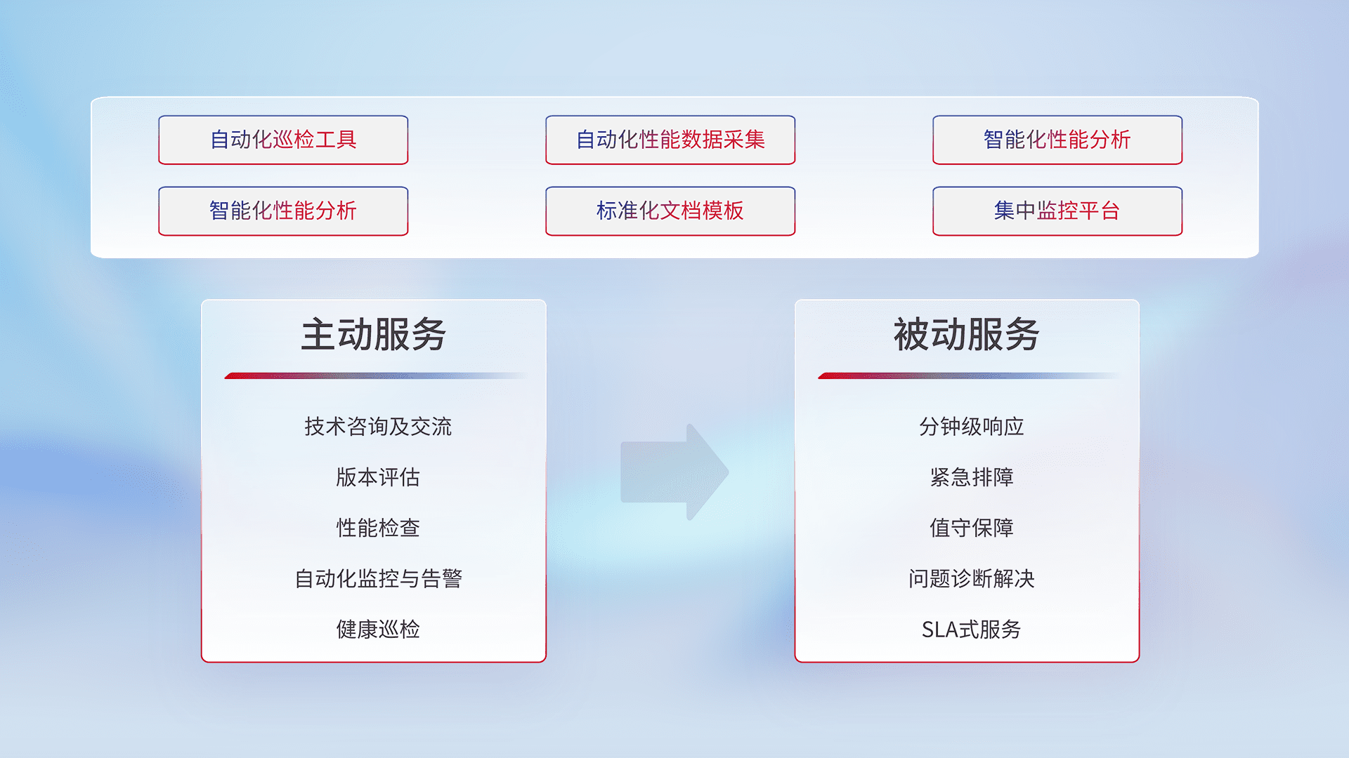 智能化工具和标准化文档,,,保障服务质量,,,,提供主动服务(包含技术咨询、、、、版本评估、、、、性能检查、、、自动化监控与告警、、、健康巡检)和被动服务包含(分钟级响应、、、紧急排障、、、、值守保障、、问题诊断解决、、、、SLA服务)。。。。